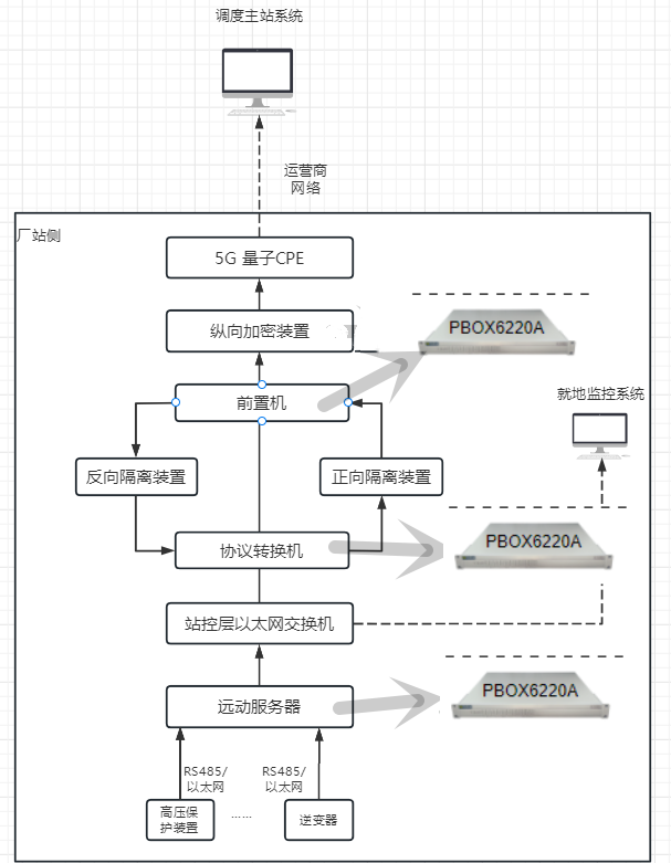 通過PBox6220A將采集到的逆變器數(shù)據(jù)和高壓保護裝置數(shù)據(jù)上傳到站控交換機,經(jīng)由另一臺PBox6220A進行規(guī)約轉(zhuǎn)換成系統(tǒng)可以識別的數(shù)據(jù),經(jīng)過正反向隔離裝置再將數(shù)據(jù)經(jīng)由前置機傳遞到PBox6220A進行數(shù)據(jù)加密保障數(shù)據(jù)安全再由5G量子CPE通過運營商網(wǎng)絡傳輸?shù)娇蛻舻恼{(diào)度系統(tǒng),客戶可以遠程監(jiān)控光伏電站運營數(shù)據(jù)。